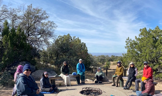 On Sunday Oct. 30 about a dozen of us gathered at the beautiful Kiwanis area of Elena Gallegos Open Space in the foothills of the Sandias for a Day of Mindfulness. It was a beautiful, peaceful day where we strengthened our connections with nature, our practice, and each other. We sang some songs, did some mindful walking, seated meditation, had lunch, and listened to some guided relaxation and a children’s book The Coconut Monk by Thay. Altogether it was a lovely day, skillfully facilitated by Bee and David. Here are a few photos.